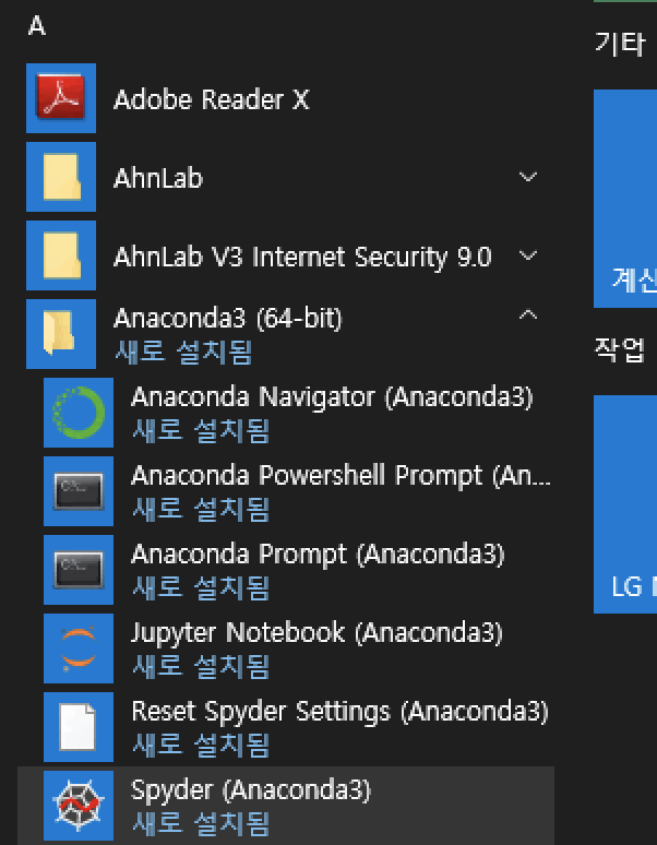 시작 버튼을 눌러서 Anaconda navigator를 찾아서 실행하자